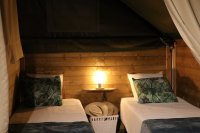 Il comprend une chambre avec 1 lit 140x190 cm, une chambre avec 2 lits simples 80x190 cm, séparation des chambres bois et tissus, coin repas ouvert sur la terrasse, cuisine intérieure avec passe plat intérieur et extérieur (Kit vaisselle et entretien, cafetière, micro-ondes, frigo congélateur, plaque gaz 2 feux intégrée, rangement), 1 table et 2 chaises + coffre de rangement et assise, terrasse couverte (7.50 m2), 1 table et 2 chaises, éclairage intérieur et extérieur, penderie de rangement en tissus. Pas de sanitaires (ni WC, ni salle de bain).
